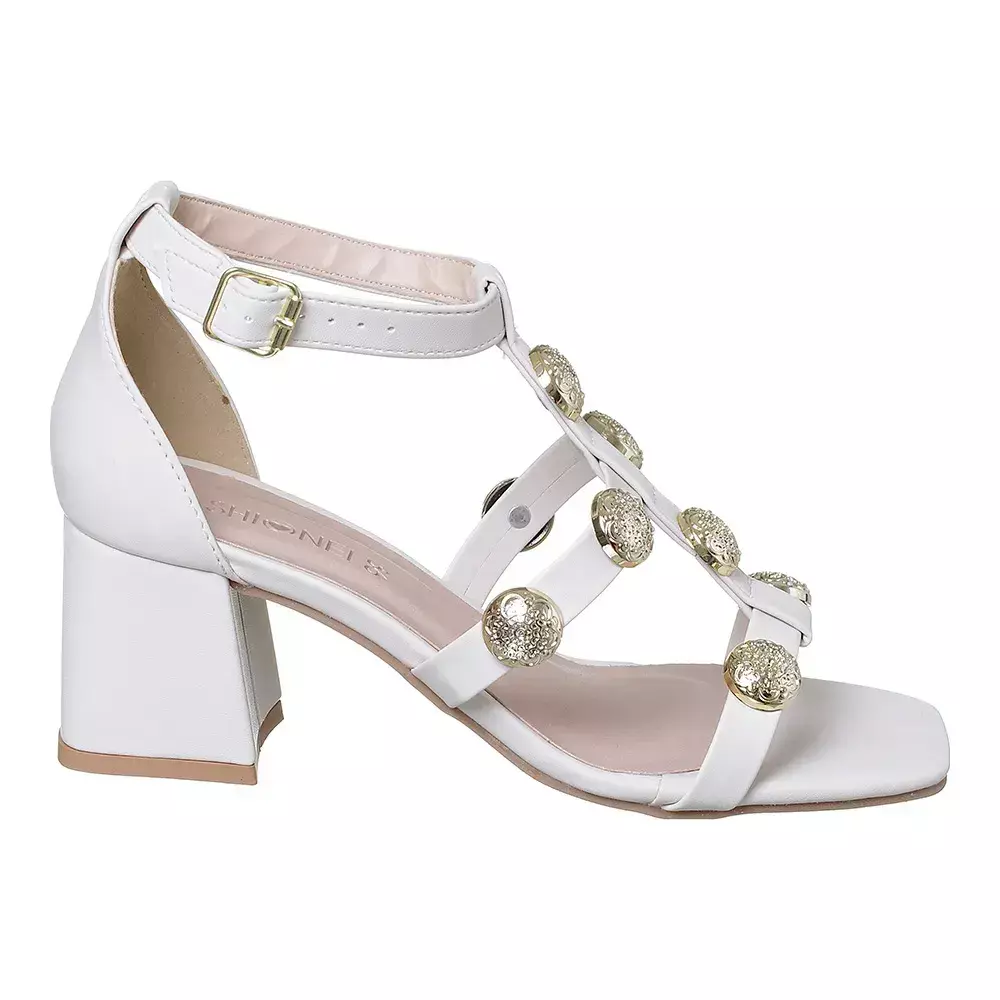 Você vai ficar linda, estilosa e confortável com sua sandália salto médio grosso tirinhas tachas tendência de moda Blogueira.